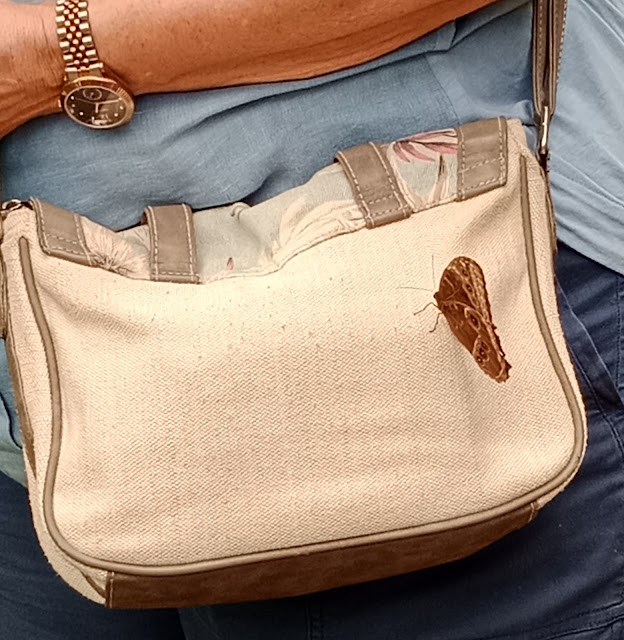 A brown butterfly alighted on my sister's handbag